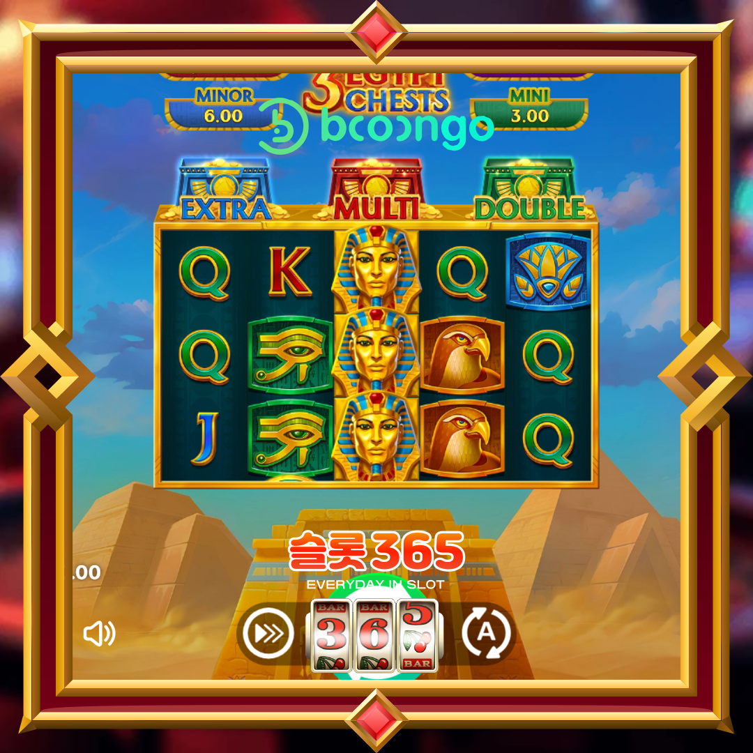 3 EGYPT CHESTS는 햇볕이 내리쬐는 이집트를 배경으로 모든 스핀이 부스터 스타일의 트리오 기능으로 연결될 수 있는 게임입니다. 기본 게임은 10개의 고정 라인이 있는 고전적인 5릴 3열 레이아웃으로 실행되며, 액션을 따라하기 쉽게 유지하면서 시그니처 홀드 앤 윈 보너스의 토대를 마련합니다. Booongo(BNG라고도 함)와 유통 파트너인 3 Oaks는 다양한 맛의 리핀 기능과 네 가지 잭팟을 잠금 해제하는 프로그레시브 “코인” 컬렉션을 중심으로 게임을 배치했습니다.