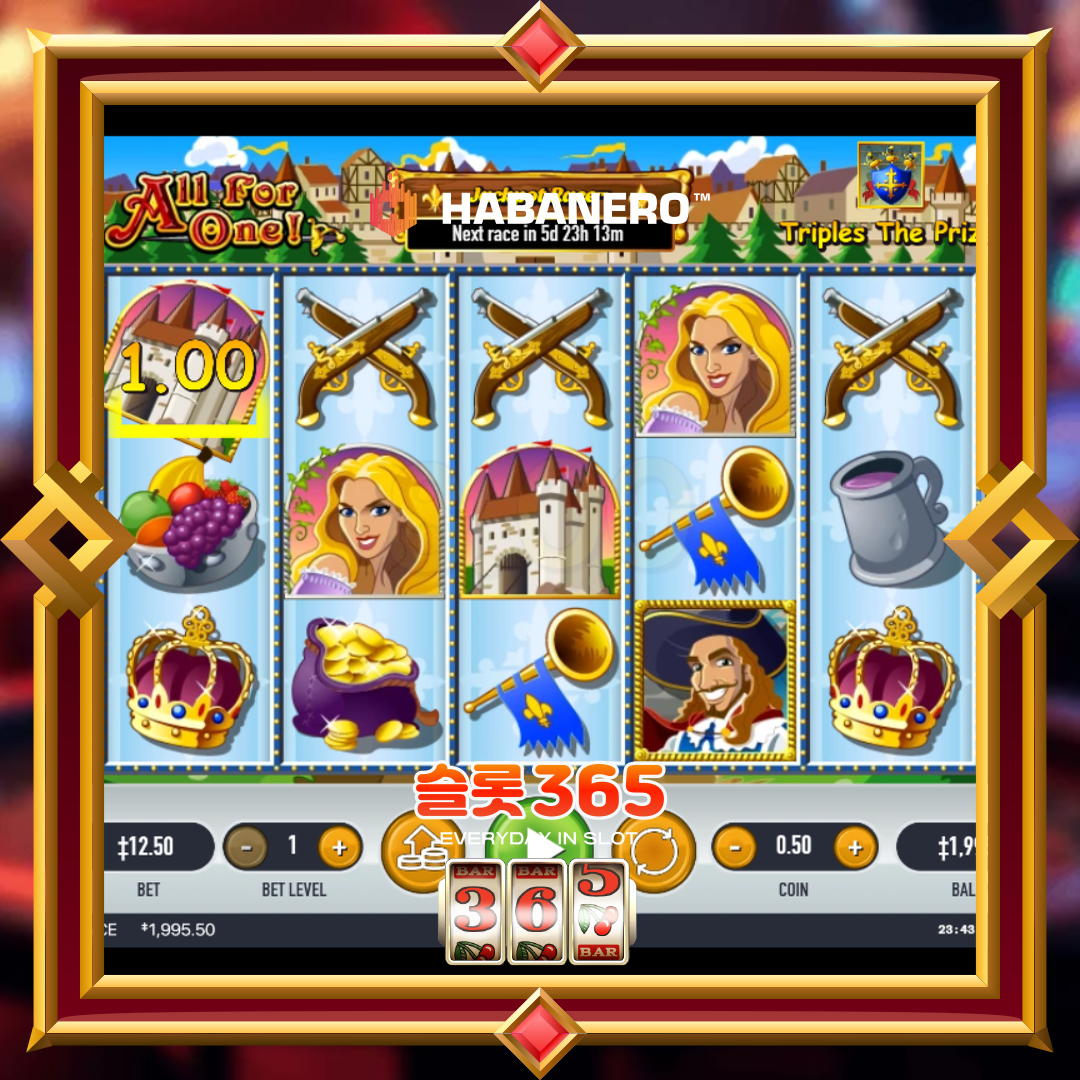 All For One은 17세기 프랑스에서 펼쳐지는 모험에서 영감을 받은 하바네로의 총사 테마 비디오 슬롯입니다. 2013년 6월 15일에 출시된 이 게임은 먼 성이 있는 시골 배경, 대담한 아이콘, 심플하고 가독성 높은 슬롯 디자인을 좋아하는 플레이어와 모든 사람에게 적합한 직관적인 컨트롤 등 클래식한 룩앤필을 채택하고 있습니다. 5 릴, 3 열 설정과 25 개의 페이 라인은 익숙한 액션을 유지하면서 승수와 프리 스핀 버스트를위한 공간을 남겨 두어 흥분을 불러 일으킬 수 있습니다.