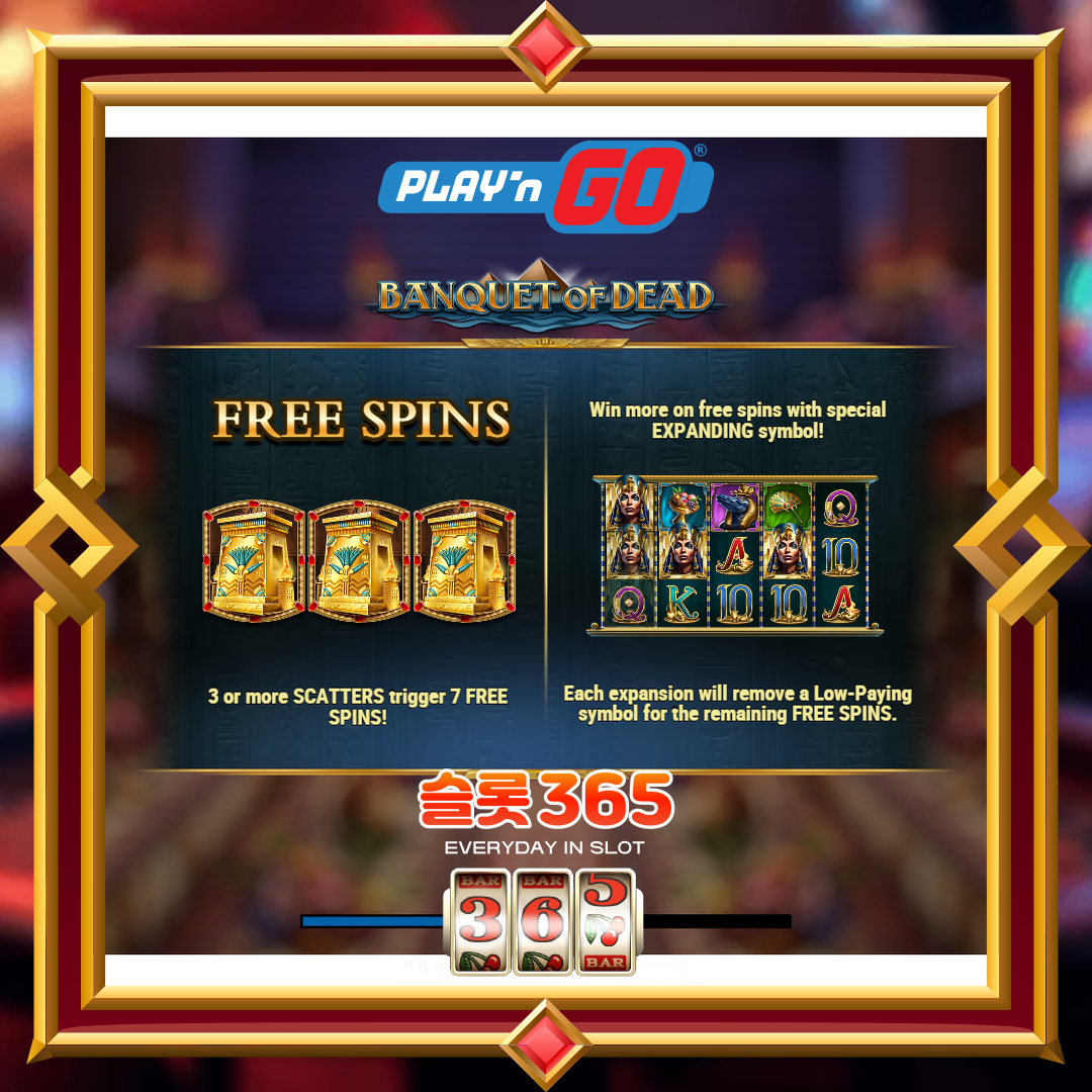 Banquet of Dead 는 플레이엔고의 5×3, 10줄 “북 오브” 스타일 슬롯으로, 보너스가 진행됨에 따라 낮은 기호가 제거되는 반전을 가진 클래식 확장 기호 프리 스핀과 짝을 이룹니다.