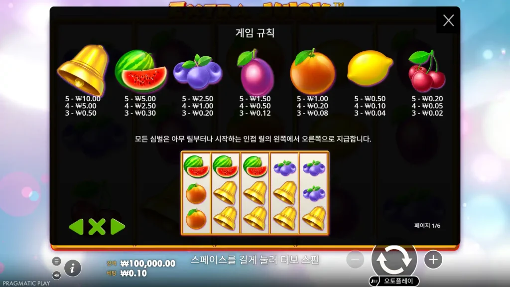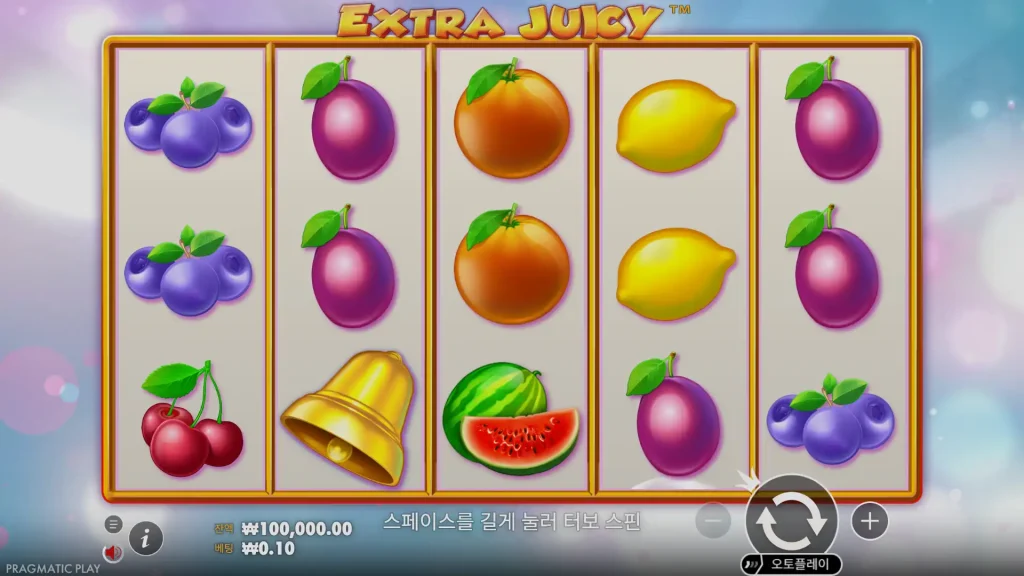 Extra Juicy는 심볼 세트를 의도적으로 타이트하게 유지합니다. 종, 7, 컷 유리 다이아몬드는 오렌지, 자두, 레몬, 수박, 블루베리, 체리와 공간을 공유합니다. 특히 와일드 심볼이 없기 때문에(프래그머티컬 플레이는 스캐터와 라인 페이에 맡기기로 결정했습니다) 게임의 흐름은 자연스러운 조합을 배치하고 스캐터를 통해 보너스를 트리거하는 것이 전부입니다. 이러한 디자인 선택은 페이 테이블을 배우기 쉽고 결과를 투명하게 만듭니다.