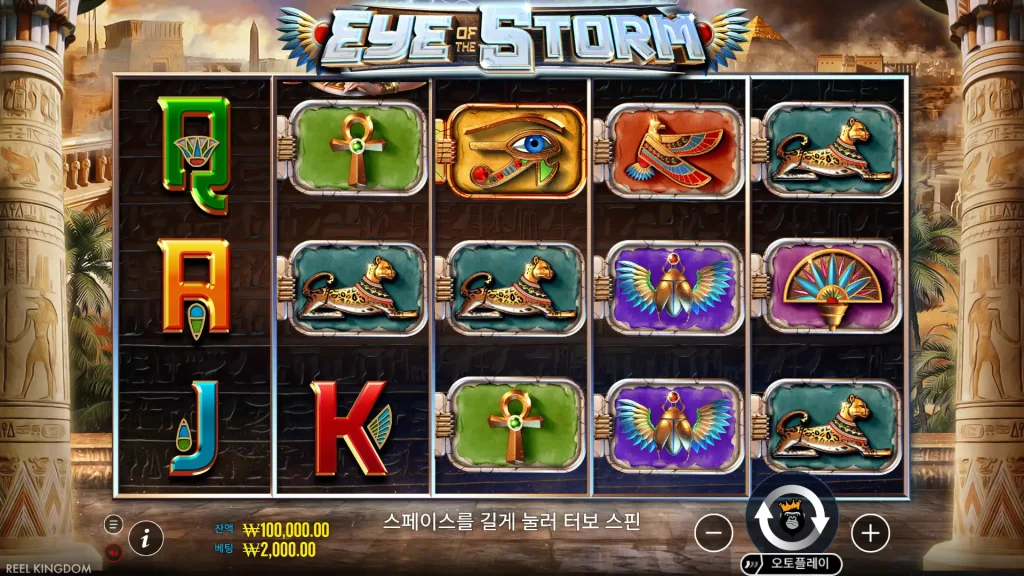 Eye of the Storm은 다가오는 모래 폭풍이 릴을 감싸고 당당한 여왕이 액션을 주도하는 양식화된 고대 이집트로 여러분을 안내합니다. 기본 게임은 10개의 고정 페이라인이 있는 클래식 5릴, 3열 레이아웃을 기반으로 제작되었으며, 이는 스튜디오와 여러 슬롯 데이터베이스에서 오랫동안 검증된 형식입니다. 이 간단한 설정은 회전 속도를 빠르게 유지하면서 더 큰 기능을 추가할 수 있는 공간을 남겨줍니다.