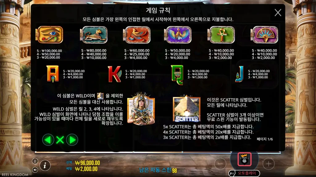 - 클레오파트라 와일드는 2~4번째 릴에 나타나며, 와일드가 승리 조합을 완성하면 전체 릴을 채울 수 있도록 확장됩니다.