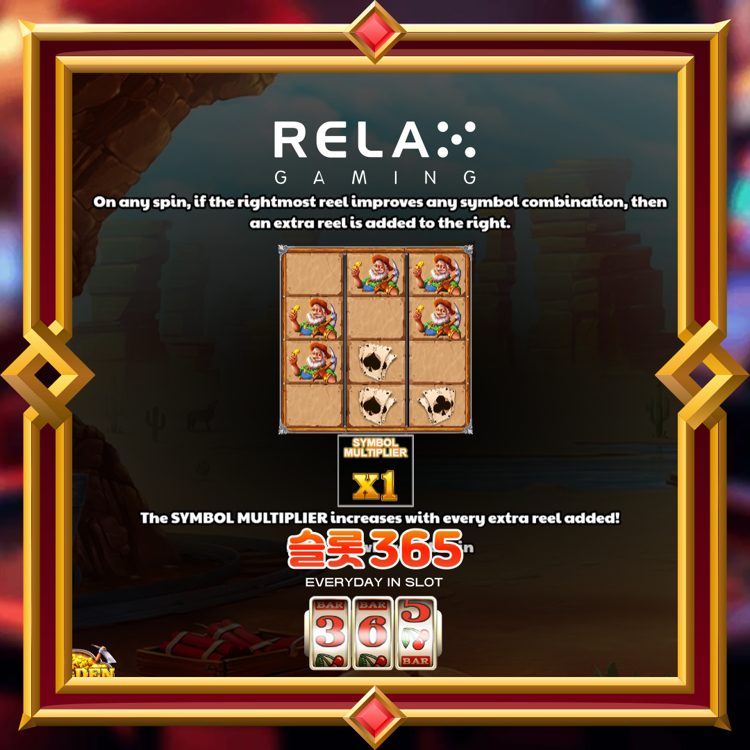 Golden Haul Infinity Reels은 3릴, 4열의 컴팩트한 레이아웃으로 가장 오른쪽 릴을 포함한 승리 조합을 얻을 때마다 늘어납니다. 릴이 추가될 때마다 프로그레시브 승리 배수가 1씩 상승하므로, 연달아 승리하면 화면에서 지뢰가 더 깊숙이 뚫리면서 눈덩이처럼 빠르게 늘어날 수 있습니다. 확장 릴 구조는 인피니티 릴 시스템의 특징이며, 이 게임이 평범한 스핀에서도 생동감을 느낄 수 있는 핵심 이유입니다.