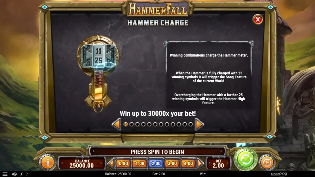 HammerFall은 해머 미터를 과충전할 수도 있습니다. 같은 라운드에서 초기 25개의 심볼을 넘어 50개의 승리 심볼을 획득하면, 게임은 다음 월드로 이동하기 전에 세 가지 노래 기능을 연속으로 발사하는 무료 라운드인 해머 하이를 시작합니다. 이 순서에서는 모디파이어가 그리드를 초기화하지 않고 연속으로 쌓이기 때문에 대규모 텀블 라운드가 발생할 수 있습니다.