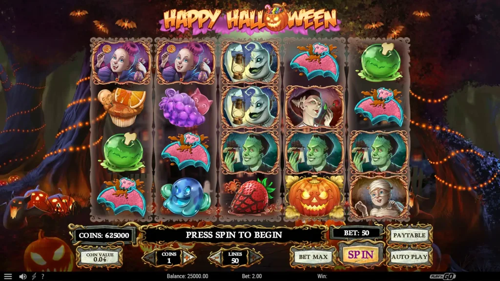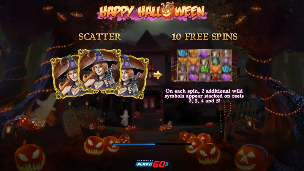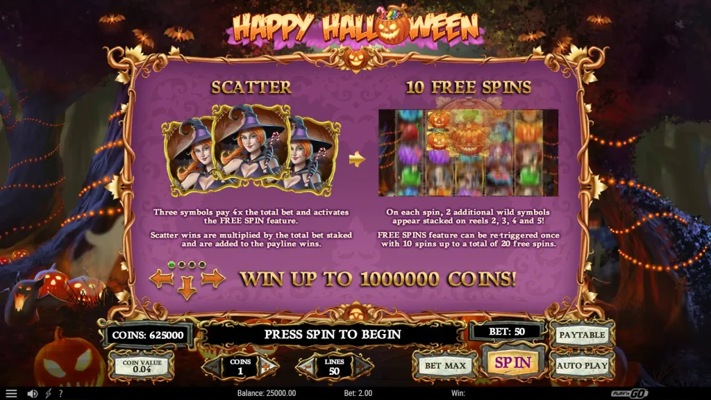 Happy Halloween은 최대 50개의 라인, 마녀가 트리거하는 프리 스핀 기능, 계절별 몬스터와 사탕 테마를 갖춘 5 릴 플레이엔고(PLAY’n GO) 비디오 슬롯입니다.
