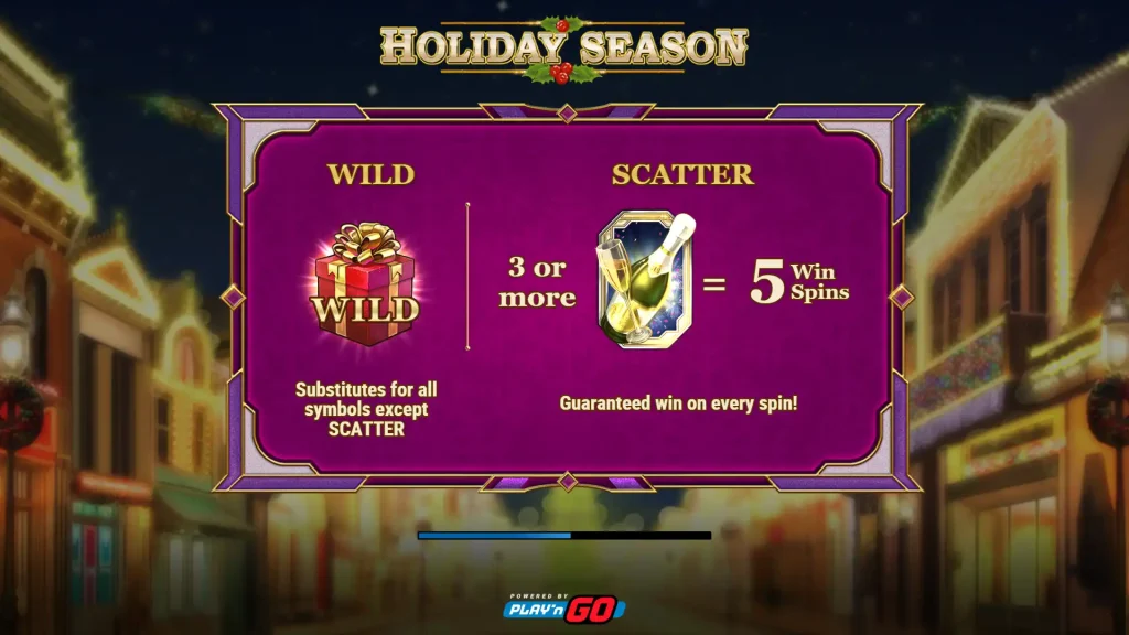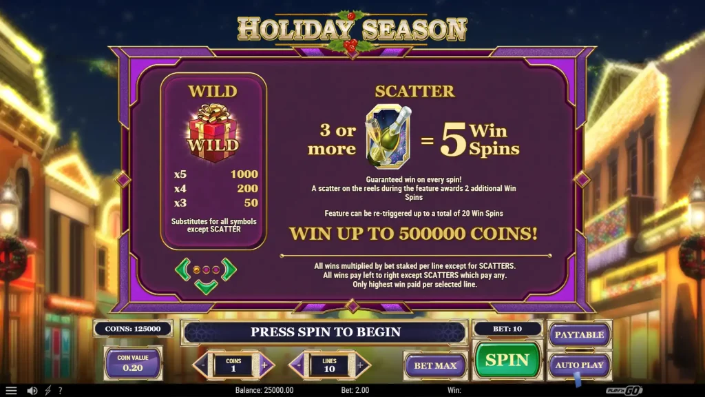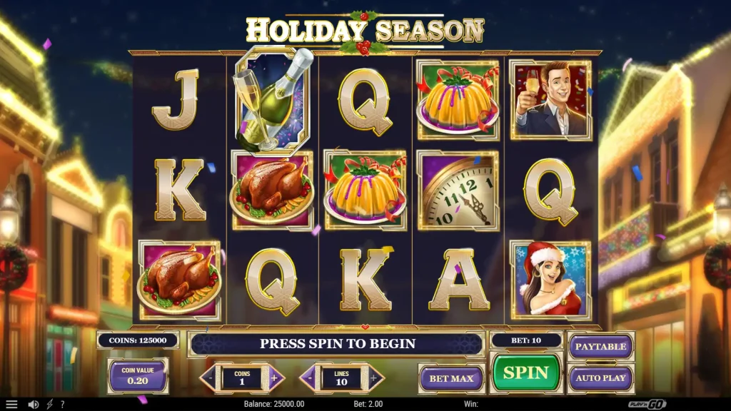 Holiday season은 플레이엔고의 5×3, 10라인 축제 슬롯으로, 클래식한 크리스마스 이미지와 승리 보장 “윈 스핀” 및 구성 가능한 RTP를 결합한 슬롯입니다.