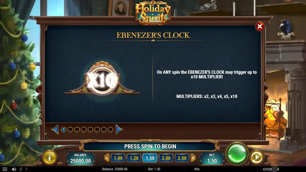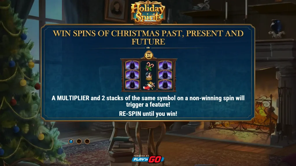 Holiday Spirits은 플레이엔고의 크리스마스 테마 온라인 슬롯으로, 와일드, 멀티플라이어, 승리 보장 “윈 스핀”으로 가득한 아늑한 3 릴, 5 페이 라인 슬롯을 통해 “크리스마스 캐롤”의 캐릭터에 생동감을 불어넣습니다