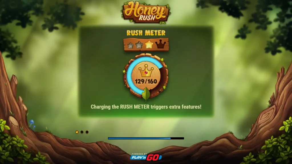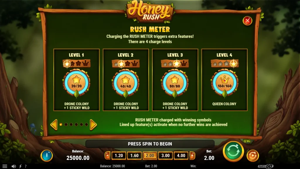 Honey Rush는 기존의 프리 스핀 보너스 라운드를 사용하지 않습니다. 대신 강력한 클러스터 승리 또는 와일드 강화 캐스케이드를 유발할 수 있는 러시 미터와 콜로니 기능을 중심으로 게임의 흥미진진함을 더했습니다.