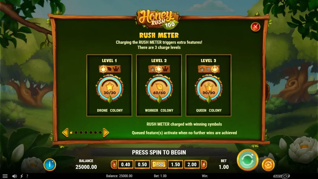 Honey Rush 100은 Play’n GO의 그리드 슬롯으로, 육각형 클러스터 페이 방식에 연쇄 승리, 고정 와일드, 강력한 군락 기능을 해제할 수 있는 충전 미터를 적용했습니다.