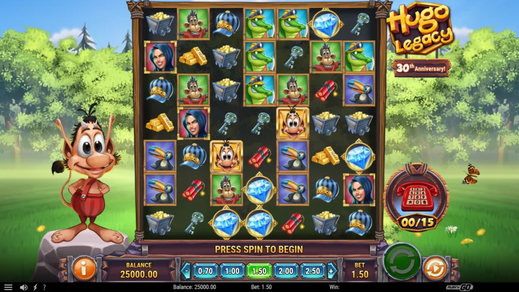Hugo Legacy는 트롤의 30주년을 기념하여 캐릭터 파워, 과충전 미터, 티어별 프리 스핀을 제공하는 플레이엔고의 7×7 클러스터 유료 그리드 슬롯입니다.