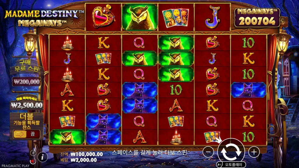 Madame Destiny Megaways는 2021년 1월 18일에 출시된 Pragmatic Play의 이전 마담 데스티니 슬롯을 메가웨이즈 엔진과 더 어둡고 극적인 연출로 새롭게 재해석한 버전입니다. 이 게임에서는 신비한 선견자가 액션을 주재하는 동안 수정 구슬, 타로 카드, 까마귀가 릴을 가로질러 회전하는 점쟁이의 캐러밴으로 여러분을 안내합니다. 변동성이 높은 타이틀로 제작된 이 게임은 꾸준한 소액 지급보다는 드물지만 잠재적인 대박을 목표로 합니다.