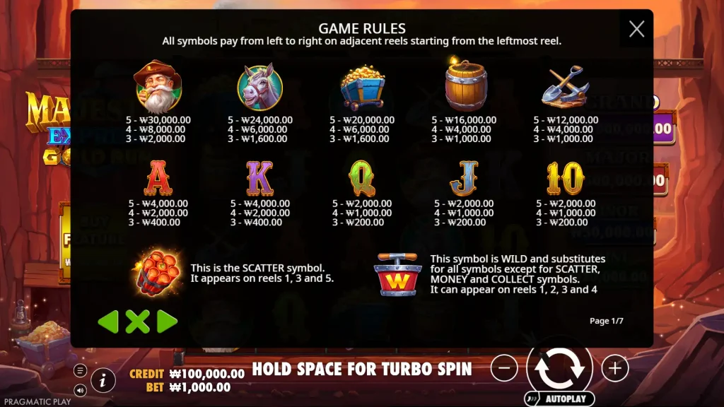 - 5번째 릴에서 기차 머니 심볼이 슈퍼 콜렉트와 함께 나오면 황금 기차가 무작위로 1배의 카트를 추가하여 수집한 금액에 곱합니다.