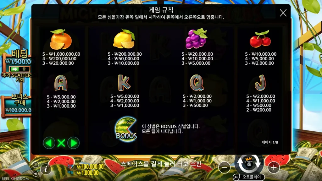 - 3개 이상의 워터멜론 스캐터 심볼이 나타나면 프리 스핀과 리스핀 메커니즘으로 보너스 라운드가 시작됩니다.