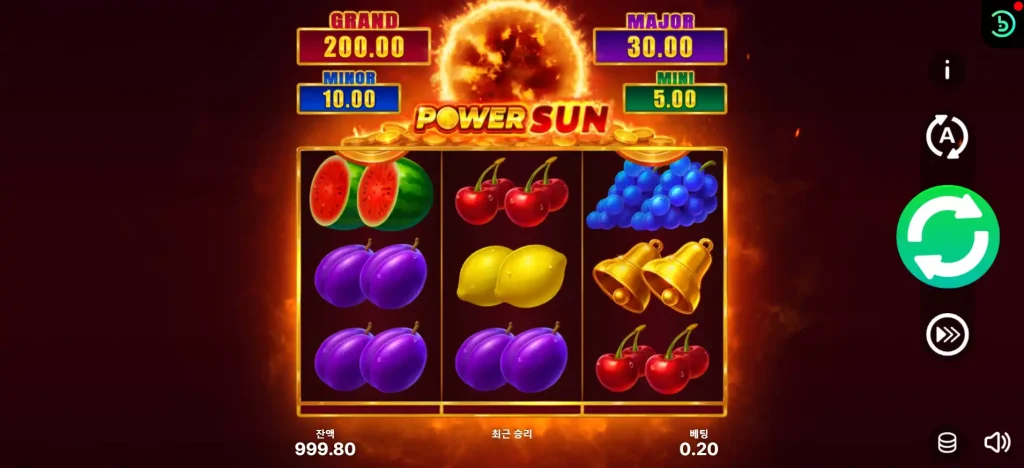Power Sun은 의도적으로 단순함을 유지합니다. 이 게임은 고전적인 3×3 레이아웃으로 제공되며 5개의 고정 라인에 걸쳐 지불하며, 전통적인 과일 기계의 단순한 느낌과 현대적인 비주얼을 결합합니다. 7, 종, 광택이 나는 과일과 같은 기호들이 대담하고 대비가 높은 릴에서 회전하며 “펍 슬롯에서 한 단계 업그레이드된” 분위기를 전달하지만 오늘날의 온라인 플레이에 맞게 포장되어 있습니다. 긴 학습 곡선 없이 바로 액션을 즐길 수 있는 슬롯을 원하신다면 이 컴팩트한 설정이 매력적입니다.