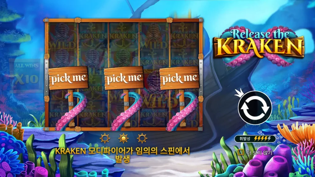 - 유료 스핀에서 랜덤 기능이 트리거되어 특별한 와일드 효과를 추가할 수 있습니다: 거대한 크라켄 와일드(3×4 와일드), 전염성 크라켄 와일드(퍼지는 와일드), 크라켄 잠금 와일드(잠긴 와일드로 홀드 앤 스핀).