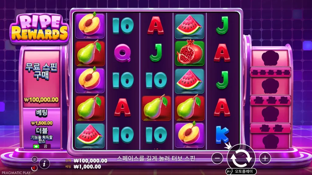 Ripe Rewards는 40개의 페이 라인, 높은 변동성, 기본 96.02% RTP, 최대 10,000배의 잠재적 승률을 제공하는 프래그마틱 플레이의 5×5 과일 테마 슬롯입니다.