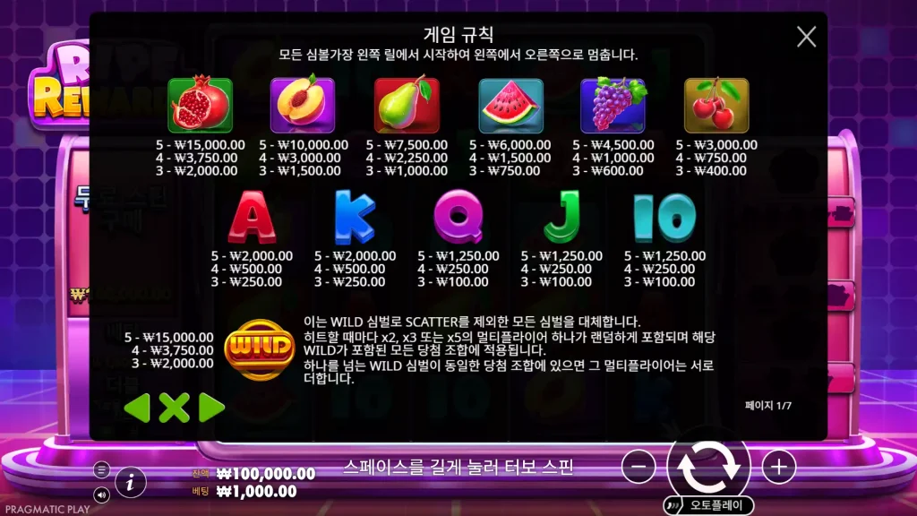 Ripe Rewards은 체리, 포도, 수박, 배 등 풍부한 과일 심볼과 낮은 지불금을 위한 왕족으로 배경을 설정합니다. 익숙한 팔레트이지만 그 밑에 있는 엔진이 슬롯에 정체성을 부여합니다. 승리는 왼쪽에서 오른쪽으로 40개의 라인에 걸쳐 형성되며, 기본 게임에서는 와일드를 사용하여 조합을 완성하거나 개선합니다. 이러한 와일드가 주목할 만한 점은 와일드의 배수가 2배, 3배, 5배가 될 수 있으며, 두 개 이상의 와일드가 동일한 승리에 기여하는 경우 그 값이 합산되어 적용된다는 것입니다. 이 “가산” 동작은 한 번의 추가 와일드로 인해 라인 히트의 크기가 크게 달라질 수 있기 때문에 일반 스핀도 흥미롭게 만듭니다.