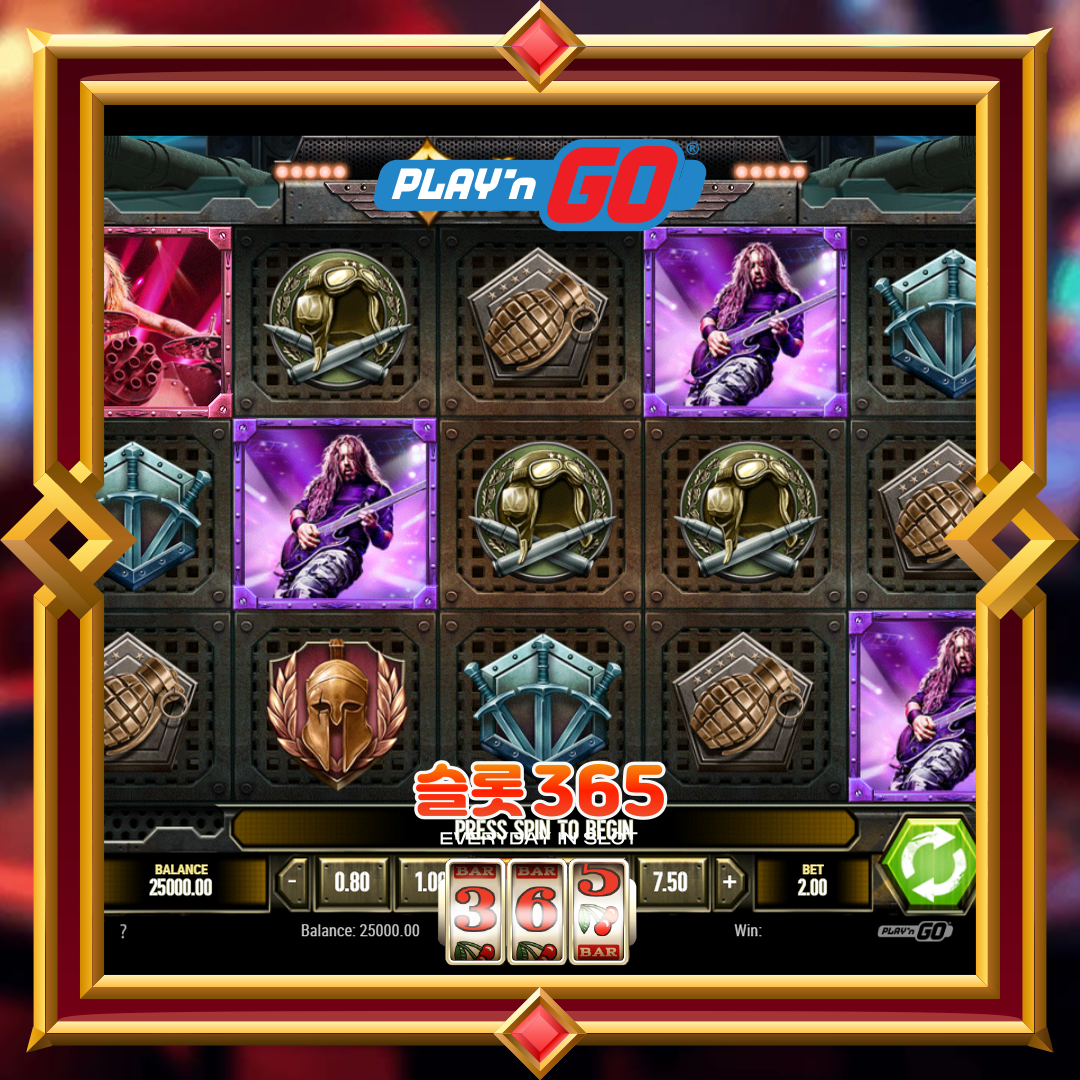 - 스캐터 심볼은 밴드 로고이며, 스캐터 9개를 획득하면 7번의 무료 스핀이 주어지는 배틀먼트 스핀이 발동됩니다.