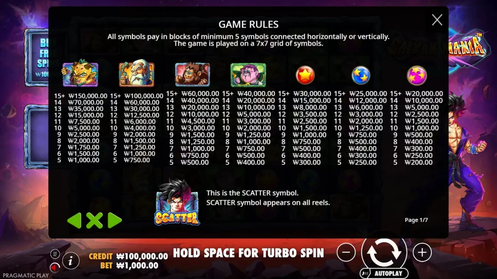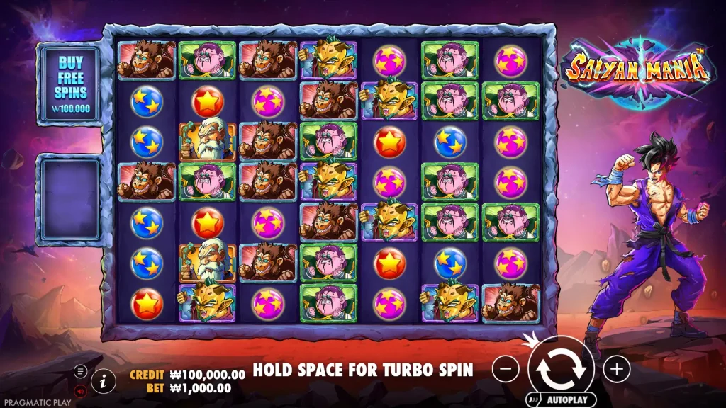 Saiyan Mania는 텀블링 승리, 멀티플라이어 스팟, 프리 스핀, 빠른 액션을 위한 보너스 구매 옵션이 혼합된 프래그마틱 플레이의 7×7, 클러스터 페이 슬롯입니다.