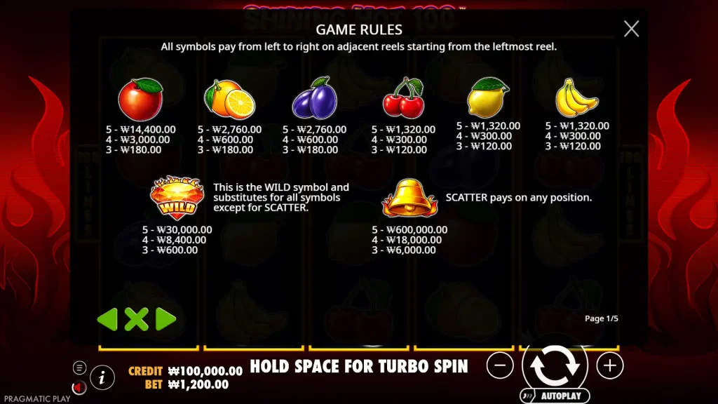 Shining Hot 100은 고전적인 과일 기계 모양에 현대적이고 세련된 스핀을 더했습니다. 릴에는 친숙한 체리, 레몬, 자두, 수박이 가득하며 다이아몬드와 벨과 같은 프리미엄 심볼이 더 큰 히트를 선사합니다. 밝은 과일 아이콘, 빛나는 불꽃, 깔끔한 인터페이스 등 의도적으로 단순하게 표현하여 빠른 회전과 간단한 승리에 초점을 맞췄습니다.