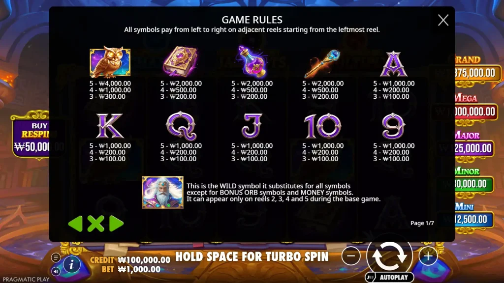 Spell Master는 2025년 8월 18일 출시되었으며, 프래그매틱 플레이의 예술적 방향성이 깃든 익숙한 완성도를 자랑합니다: 밝은 물약병, 부엉이, 마법서, 홀이 카드 랭크와 함께 릴에 등장하며, 수염 난 마법사 본인이 와일드 심볼로 대체될 수 있습니다. 와일드는 일반 지급 심볼을 대체하여 조합을 완성하며, 기본 게임 중 첫 번째 릴을 제외한 모든 릴에 등장할 수 있어 50라인 그리드에서 연결될 추가 기회를 제공합니다.