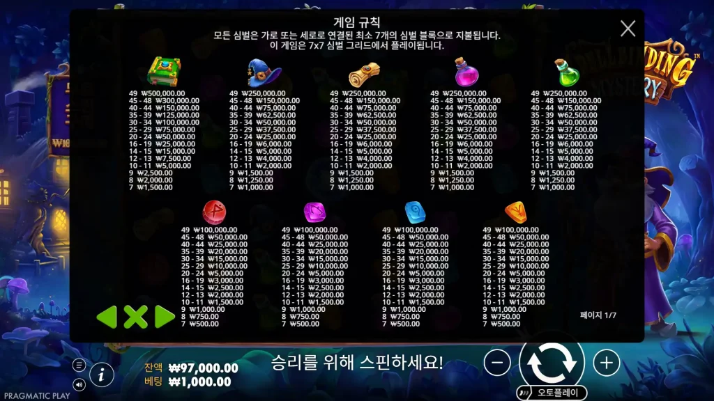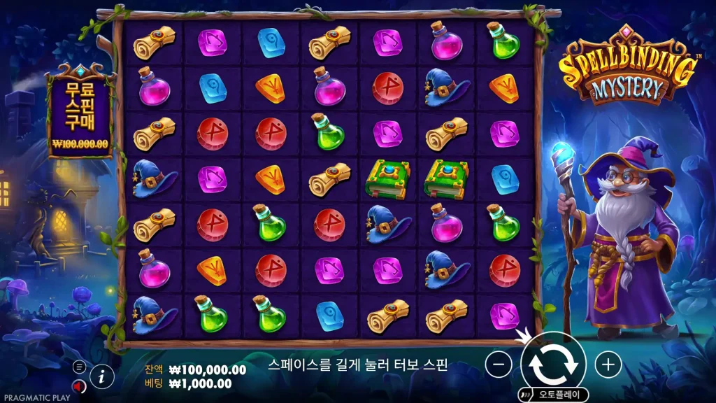Spellbinding Mystery는 미스터리 심볼, 멀티플라이어 와일드, 최대 10,000배의 승리를 위한 프리 스핀이 혼합된 프래그매틱 플레이의 7×7 클러스터 페이 슬롯입니다.