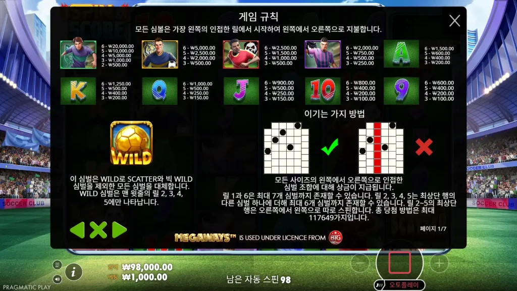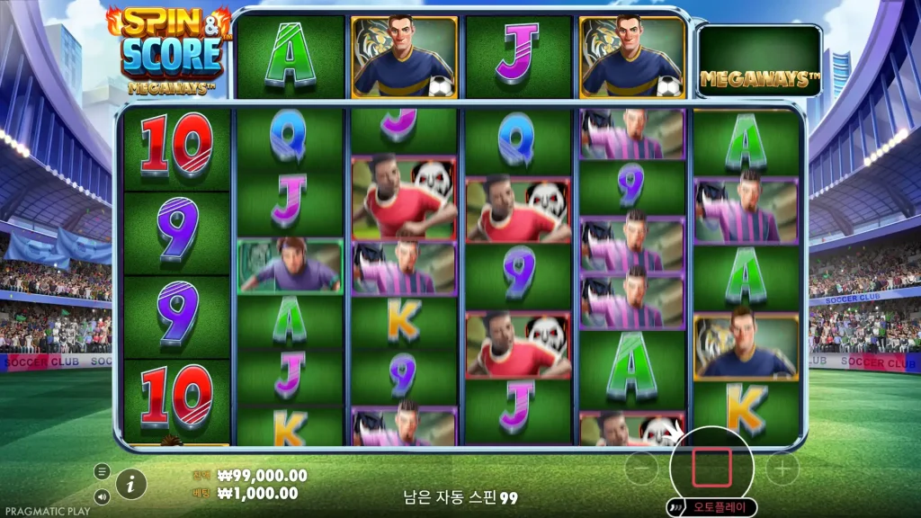 Spin & Score Megaways는 메가웨이즈 엔진을 사용하여 텀블, 와일드, 프리 스핀으로 최대 117,649가지 방법으로 승리할 수 있는 프래그매틱 플레이의 축구 테마 슬롯입니다.