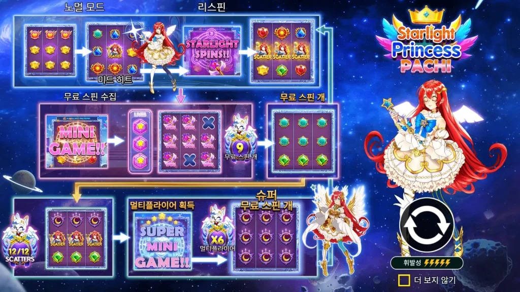 Starlight Princess Pachi는 2024년 5월 말 출시되었으며, 더 넓은 스타라이트 프린세스 라인의 스핀오프로 자리매김하지만, 이전에 출시된 텀블링 방식의 대형 그리드 타이틀과는 차별화된 메커니즘을 지닙니다. 독립 리뷰에 따르면 약 5회 스핀당 1회의 히트 빈도를 보이며, 기능의 직관성을 강조합니다. 프리 스핀을 유발하는 스캐터 리스핀, 슈퍼 프리 스핀으로의 전환, 그리고 누적된 배율로 보장되는 승리까지. 결과적으로 인내와 타이밍을 보상하는 리듬이 형성됩니다: 베이스 게임을 견디며 스캐터를 모으고, 슈퍼 라운드에서 저장된 배율을 일관되고 강화된 승리로 전환하는 것입니다.