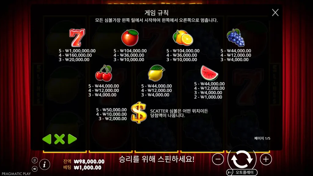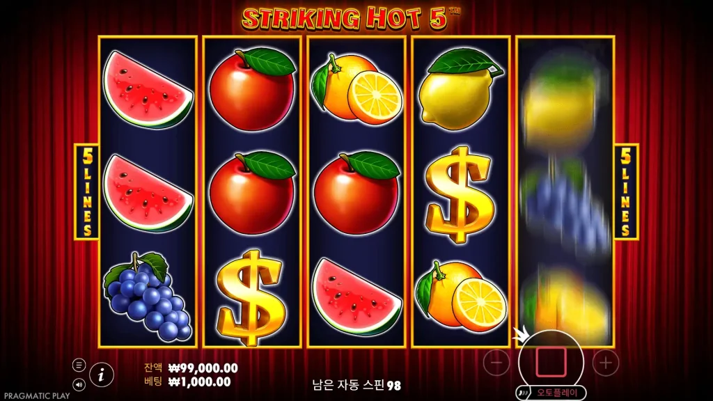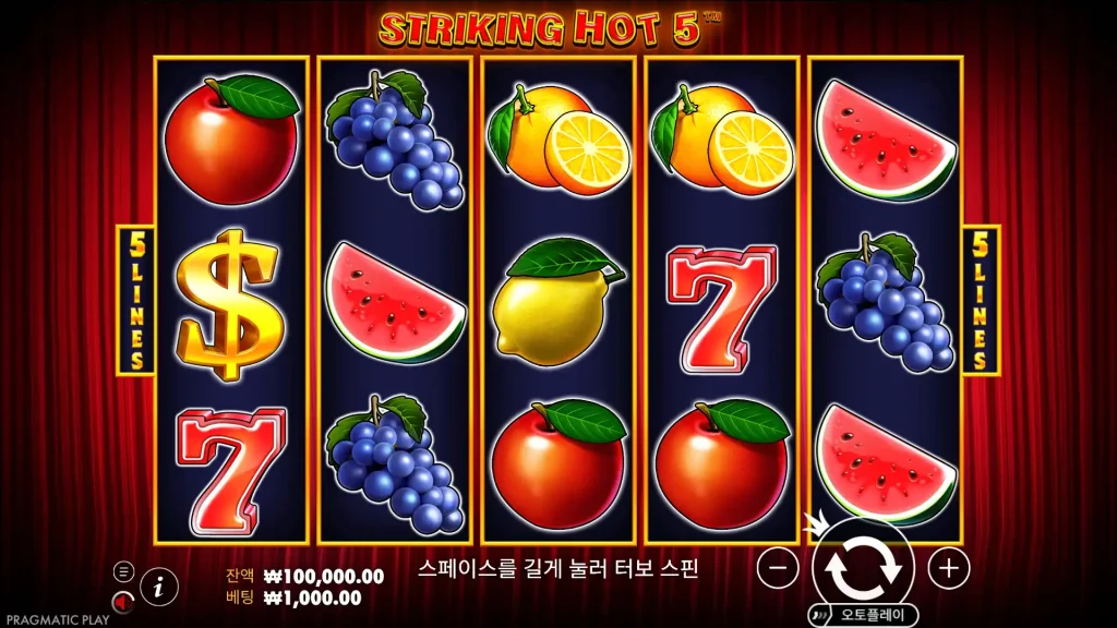 Striking Hot 5는 기능이 많은 게임 플레이보다는 라인 히트와 분산 지불에 초점을 맞추고 있습니다. 프리 스핀 라운드와 배울 보너스 게임이 없기 때문에 각 스핀은 독립적으로 진행되며, 릴에 표시되는 것이 바로 당신이 얻는 것입니다. 이 단순한 구조는 의도적인 것입니다. 프래그머틱 플레이는 복잡한 메커니즘보다 빠르고 가독성 높은 결과를 우선시하여 “전통적인 과일 기계에 대한 신선한 해석”으로 타이틀을 디자인했습니다.