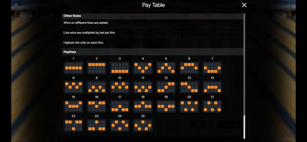 Super Strike는 2012년 6월에 출시되어 여전히 많은 카지노 로비에서 볼 수 있는 하바네로의 영원한 타이틀 중 하나가 되었습니다. 밝고 가독성이 좋은 기호, 깔끔한 컨트롤 패널, 방해받지 않고 액션을 구성하는 방해받지 않는 오디오 등 프리젠테이션은 그 시대를 잘 보여줍니다. 이러한 명확성은 페이 테이블과 도움말 화면으로 확장되어 라인 선택 방법, 베팅 레벨과 라인 수에서 총 베팅을 계산하는 방법, 각 스핀의 비용과 잠재적 수익을 정확히 이해하고자 할 때 유용한 세부 정보인 코인과 통화 표시 간의 지불금 변환 방법을 설명합니다.