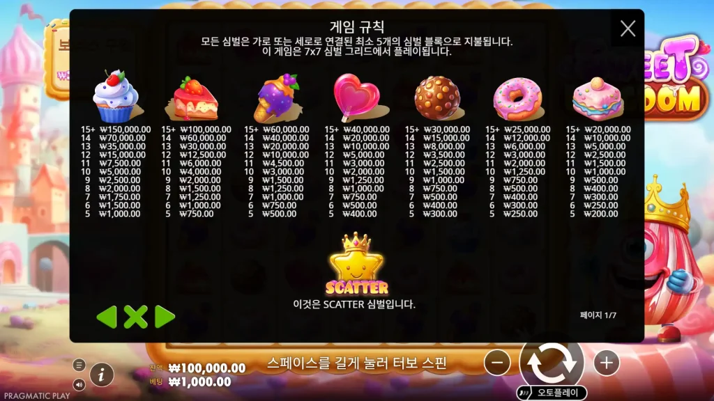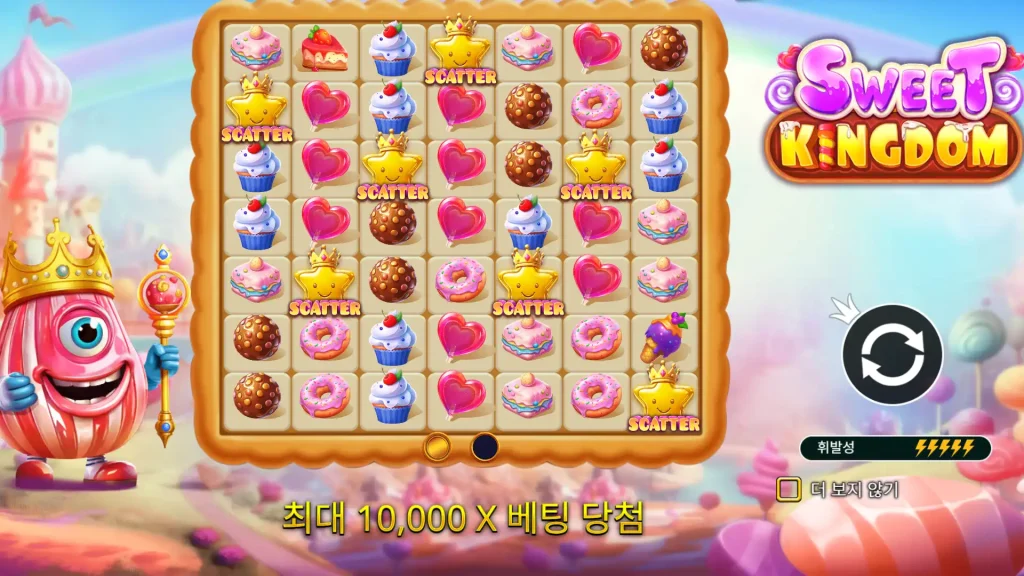 Sweet Kingdom은 텀블링 승리, 스티커 머니 심볼, 프리 스핀, 최대 10,000배의 최고 상금이 혼합된 프래그매틱 플레이의 7×7 클러스터 페이 캔디 슬롯입니다.