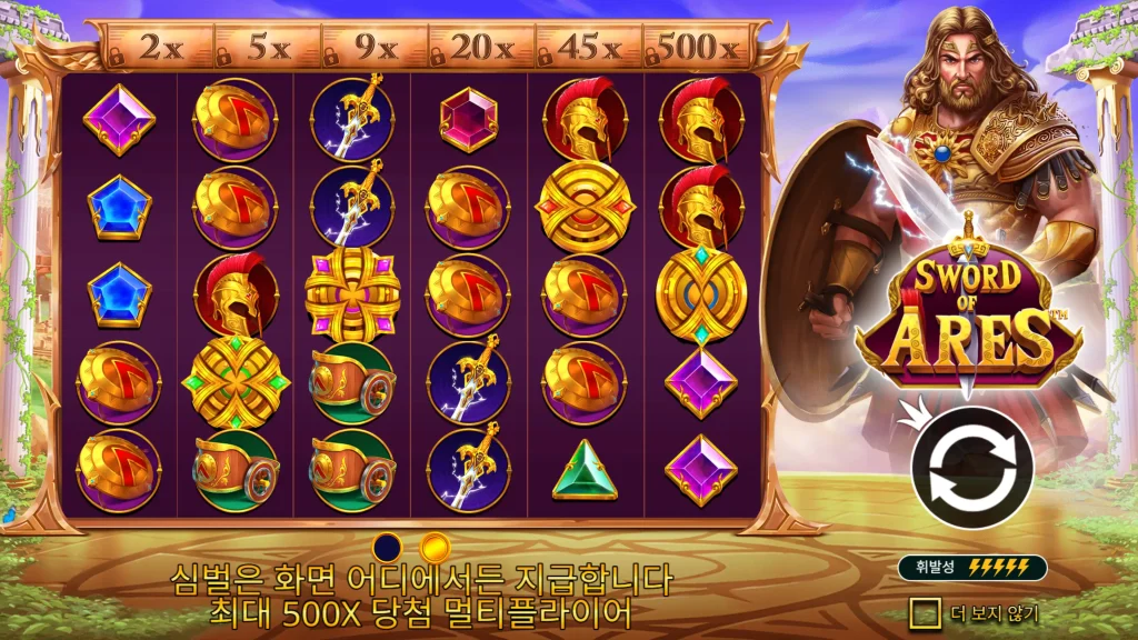 Sword of Ares는 전쟁의 신이 감독하는 고대 그리스로 여러분을 안내하며, 대담한 비주얼과 빠른 그리드 기반 형식을 결합합니다. 승리는 전통적인 페이라인을 따르지 않고, 6×5 보드의 어느 곳에서나 8개 이상의 기호가 일치하면 상금을 획득하는 “어디서나 지불”이라는 스타일로 이루어집니다 각 승리 후에는 텀블 기능이 승리한 기호를 제거하여 새로운 기호가 제자리에 놓이고 잠재적으로 순서를 연장할 수 있습니다. 이 승리, 텀블, 리필의 반복은 게임의 추진력을 높이고 모든 스핀을 개방적인 느낌으로 만듭니다.
