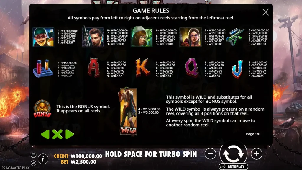 Wild Walker는 포스트 아포칼립스 도시를 배경으로, 매 스핀마다 기어다니는 전신 좀비 와일드 심볼이 등장합니다. 프래그매틱 플레이는 5×3 기본 레이아웃을 기반으로, 해당 릴 전체를 채울 수 있는 확장형 ‘워커’ 와일드 심볼을 도입해 빈번한 와일드 커버리지와 지속적인 긴장감을 조성했습니다. 공포 테마는 만화책 패널, 위험 표지판, 실험실 장비로 표현되며, 거친 사운드트랙이 액션을 더욱 박진감 있게 이끌어갑니다.