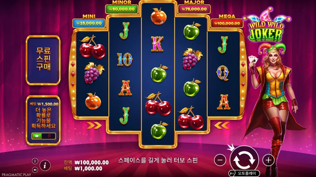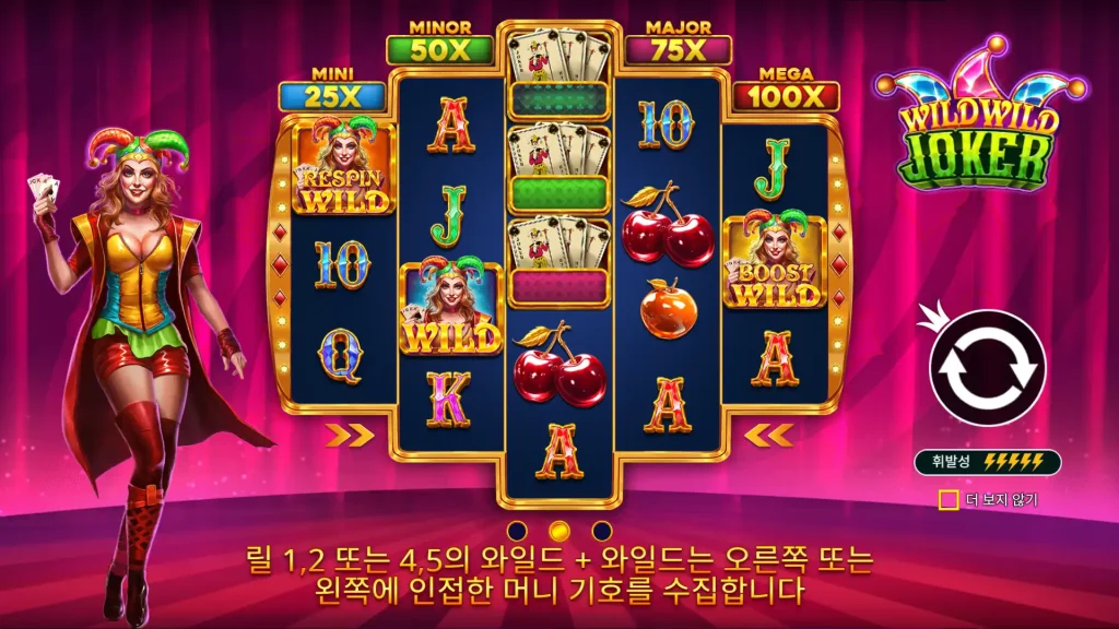 Wild Wild Joker는 네온 불빛이 반짝이는 복고풍 무대로 여러분을 안내합니다. 장난기 가득한 조커가 좌우 양방향으로 당첨이 가능한 빠르고 변동성이 높은 슬롯을 진행합니다. 양방향 시스템은 당첨 방향을 즉시 두 배로 늘려주며, 더 큰 변동성과 화려한 순간을 위한 게임의 분위기를 조성합니다. 최대 배당률 5,000배라는 헤드라인 숫자는 프래그매틱 플레이의 고성능 출시작들과 어깨를 나란히 합니다.