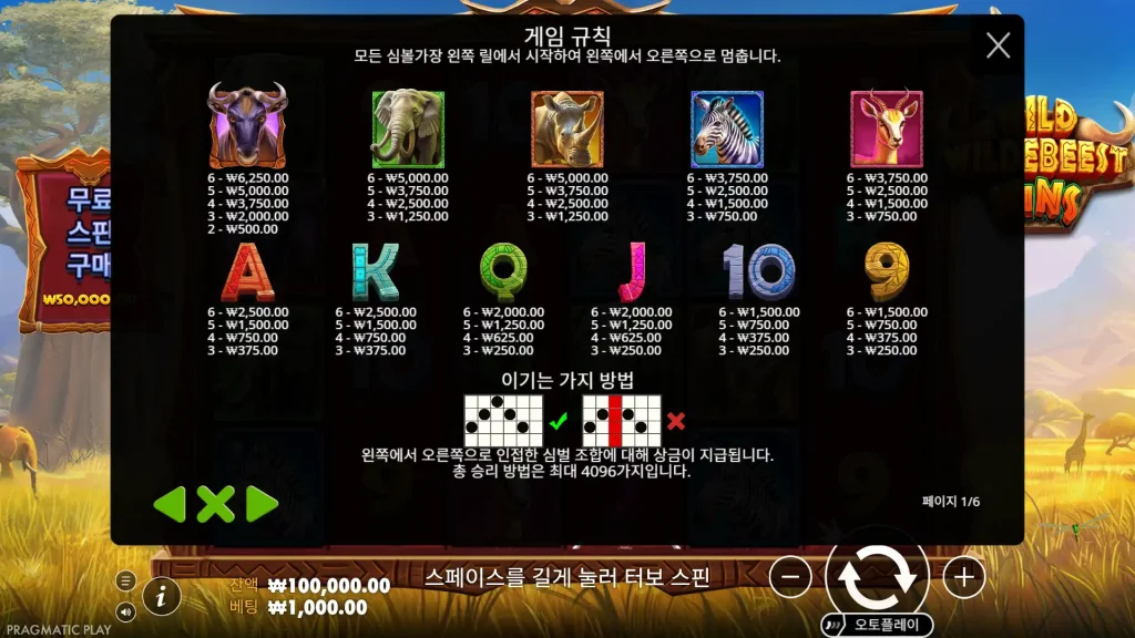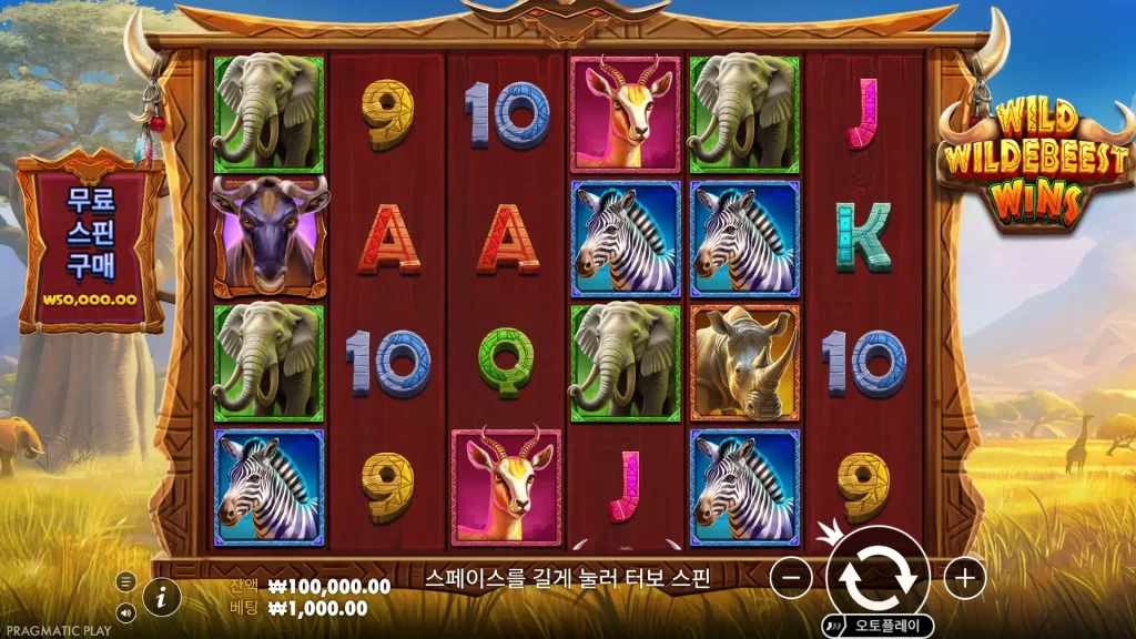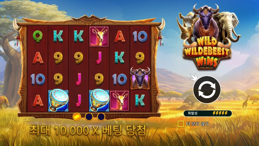 Wild Wildebeest Wins는 프래그매틱 플레이의 6×4, 4,096가지 승리 방식의 사파리 슬롯으로, 승수 와일드, 슈퍼 와일드비스트 메커니즘, 최대 10,000배의 승리를 제공합니다.